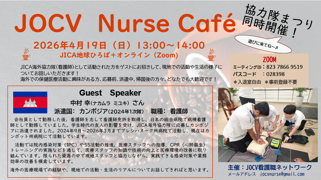 私達は、JICA協力隊及び帰国隊員から構成された職能グループです。帰国後相談や国際協力イベントに参加しJICA協力隊看護職の啓発活動を行っています。