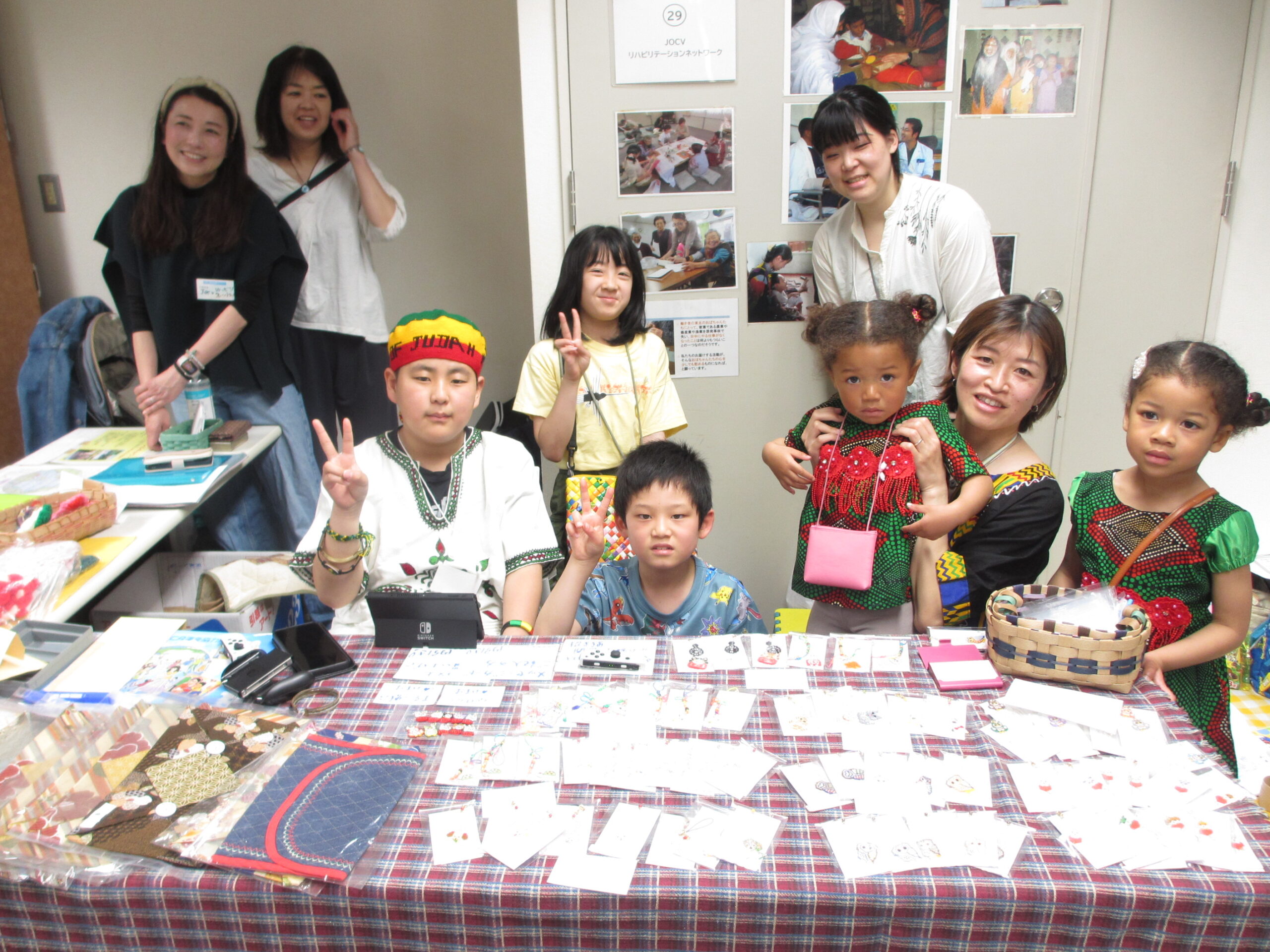 ケニア写真(自然・隊員活動・暮らし)、ケニア民芸品・装飾品・衣装展示と、カンガ(染物)、Tシャツ、サイザルバッグ、アクセサリー、木彫り動物置物等の販売