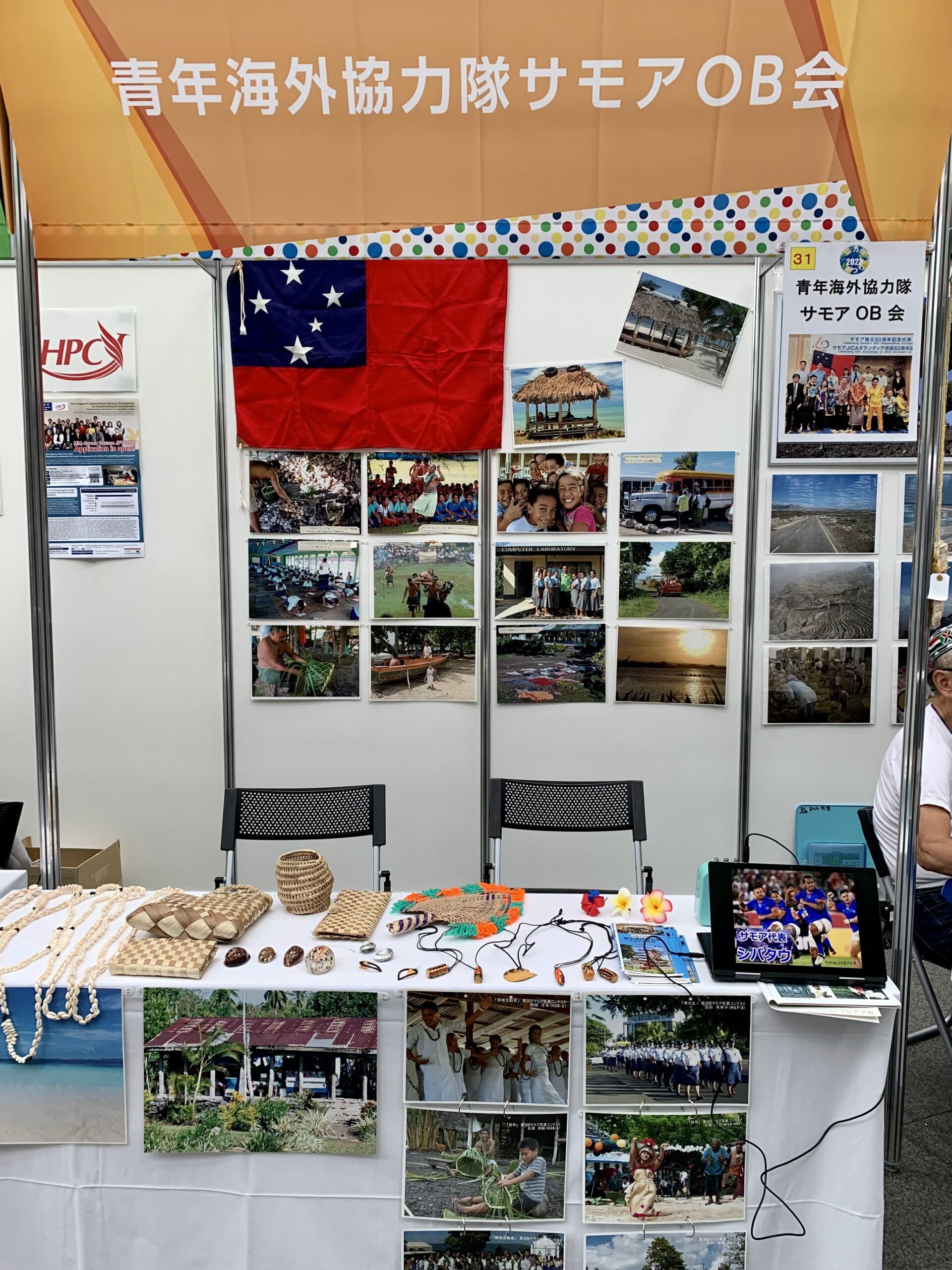 皆さん、ラバラバをご存じですか?青年海外協力隊サモアOB会のブースでは、南太平洋の島国・サモアの民芸品販売やサモアの腰巻・ラバラバの試着デモをやっています。そう、ラバラバは最も身近なサモアの衣服なのです。他にもサモアの文化や隊員たちの活動・生活の模様を写真とパンフレット、タブレット端末でご紹介しています。ブースには元協力隊員もいますのでぜひお気軽に訪れ、協力隊についての質問も何なりと受け付けています。