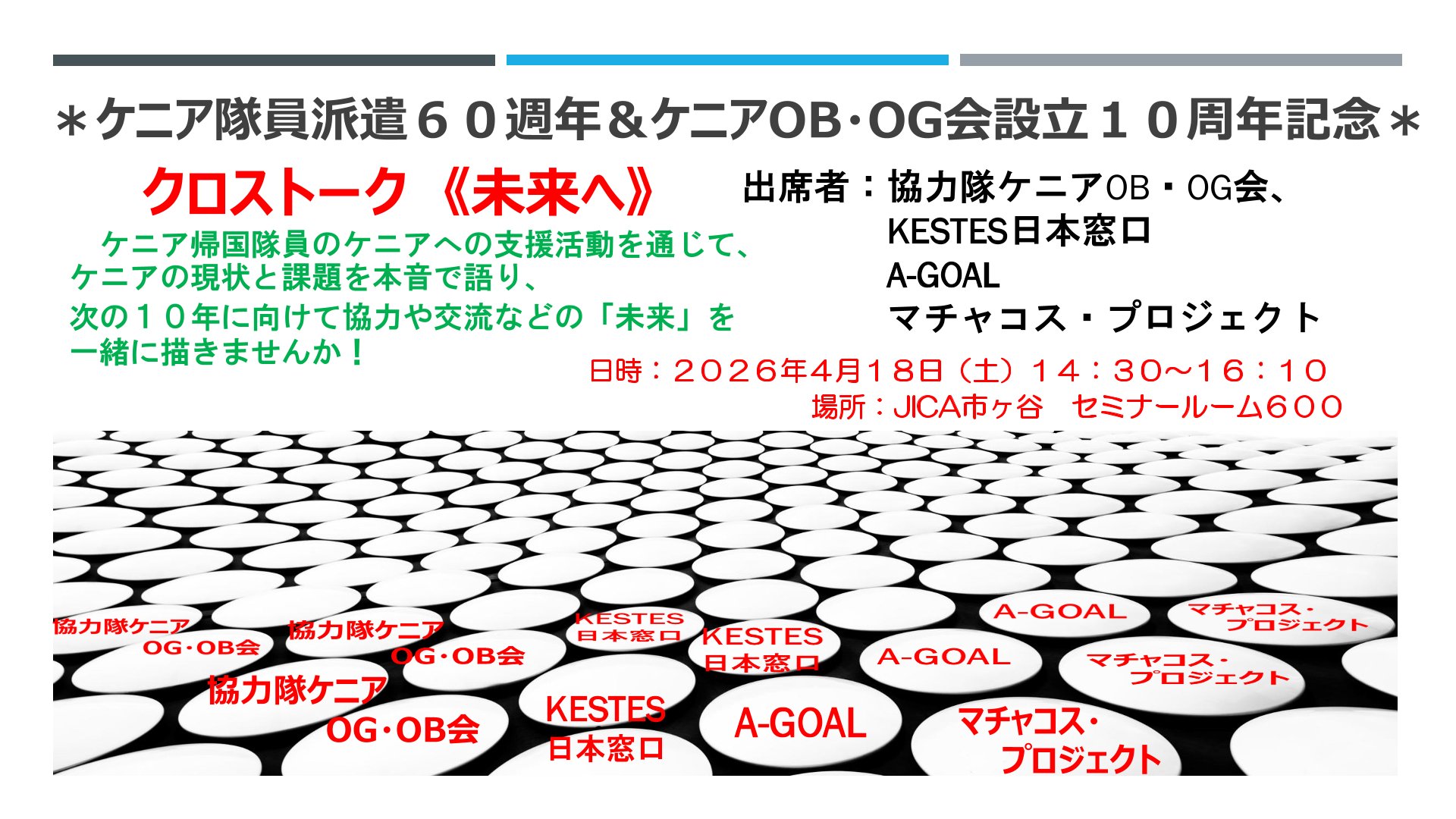 この大きな節目を記念し、特別クロストークを開催!ケニアOB・OG会に縁の深い団体が集まり、これまでの軌跡と、これからの「ケニアと日本」について語り合います。